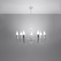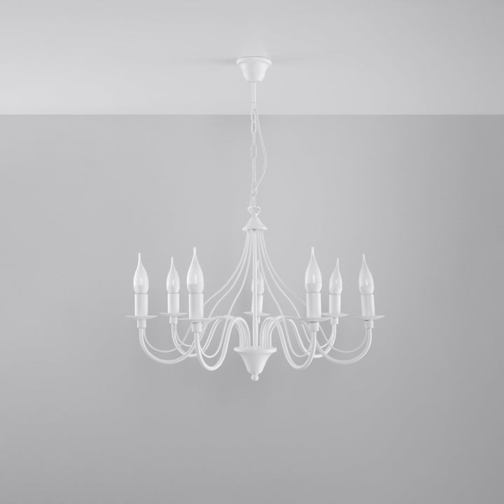 Son design s’inspire des lustres classiques à bougies, réinterprétés dans un esprit contemporain grâce à sa teinte blanche lumineuse et à ses lignes équilibrées. Les formes évoquent les chandeliers d’antan tout en restant suffisamment épurées pour s’intégrer dans un intérieur moderne, qu’il soit minimaliste, chic ou plus romantique. Visuellement, les 7 points lumineux créent un jeu d’ombres et de lumière qui habille la pièce sans l’alourdir, offrant un rendu glamour mais toujours élégant.